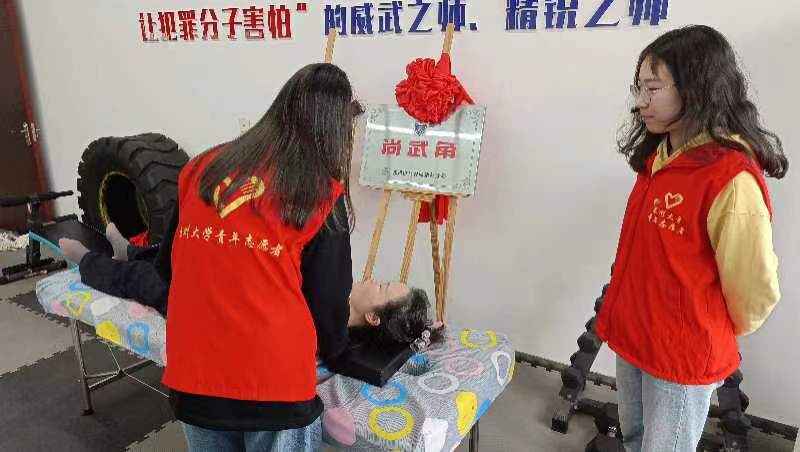 会晤之后,志愿者们跟随顾教导员来到所内的“尚武角”,利用器械和手法为民警开展康复治疗。志愿者们对每一位前来就诊的民警做了认真细致的检查,并针对不同病症和个体差异做出合适的治疗手段,共计帮助20余名民警有效缓解病痛。