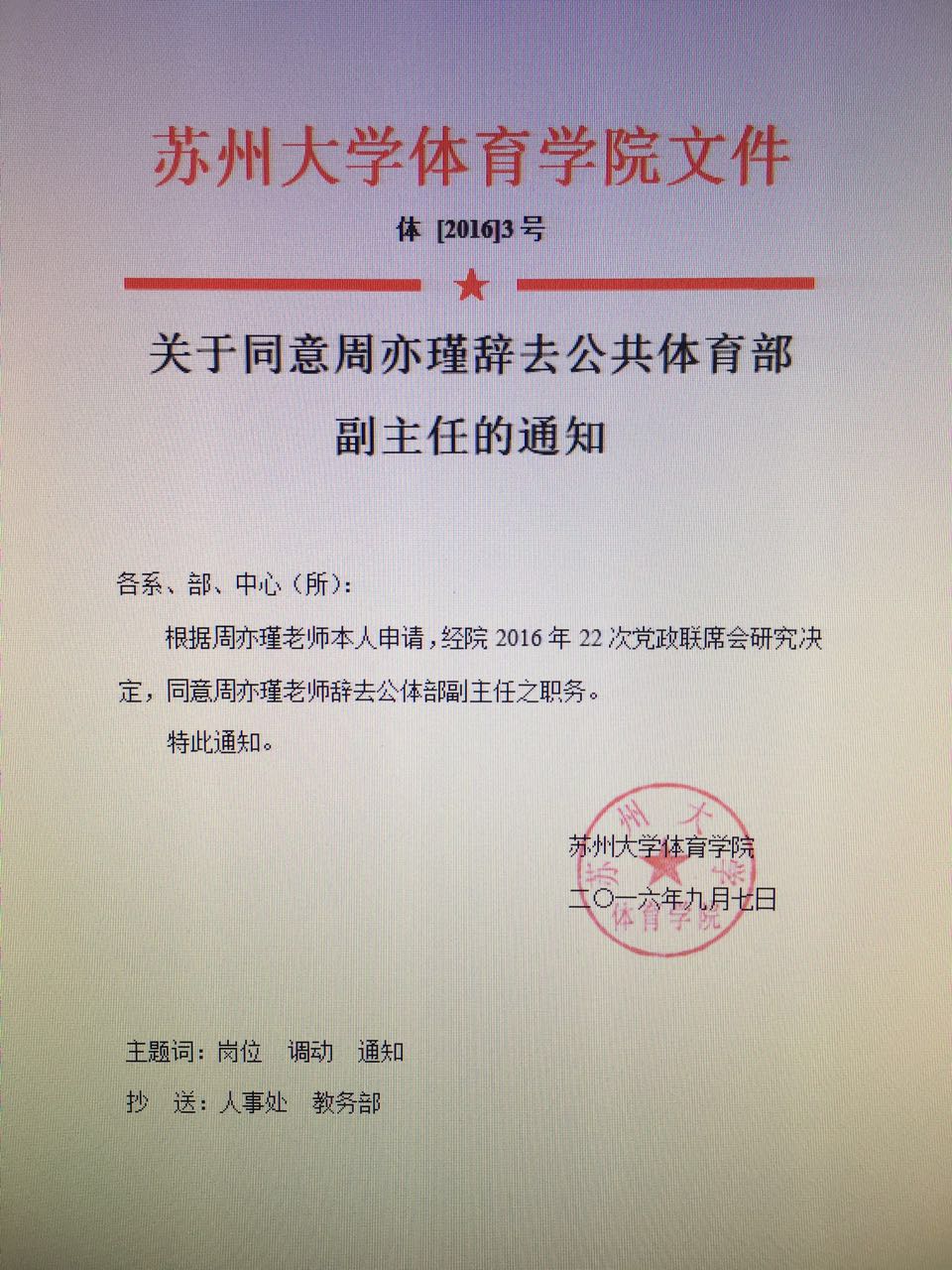 关于同意周亦瑾辞去公共体育部副主任的通知
